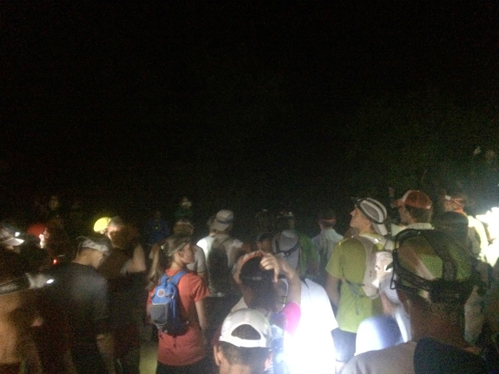 I barely remember being here. We popped in, Erik Storhiem hooked me up with some sausage and I downed a coke and we were back on the trail. I knew this climb 'the grunt' was coming and I just wanted to get it behind me. I charged that thing with everything I had, marching hard to the top. Said hello to Kelly as we went by on our way up. At the top, we turned our lights off for a minute and enjoyed the bright stars in the dark night - at least that's what I told ourselves we were doing - I needed a breather after the climb!